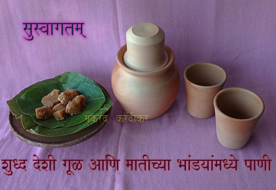 मी पाण्यासाठी मातीचा माठ, मातीचे तांब्याभांडे, पेले आणि सोबत गूळ वापरतो. शक्य झाल्यास आपणही वापरून पाहा !